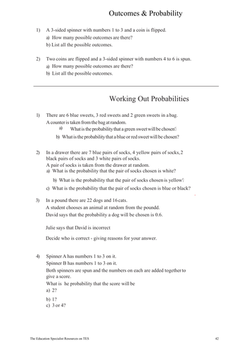 Calculating Possible Outcomes: Definition & Formula The calculating of possible outcomes is a process for determining the number of possible results for an event. There are various methods for conducting this process. The best way to calculate the ... Probability Worksheets - Math Worksheets 4 Kids Navigate through this assortment of printable probability worksheets that includes exercises on basic probability based on more likely, less likely, equally likely, certain and impossible events, pdf worksheets based on identifying suitable events, simple spinner problems, for students in grade 4, grade 5, and grade 6. Sample Spaces Worksheets - Math Worksheets Center So there will be 4 outcomes in the sample space: {red ball, green ball, blue ball, or white ball} View worksheet Independent Practice 1 Students practice with 20 Sample Spaces problems. The answers can be found below. There are 3 entry doors and 3 staircases in a building. List the sample space of using an entry door and one staircase. › statsHigh School Statistics and Probability Worksheets The Expected Value of Random Variables (HSS-MD.A.2) - It is great when math tries to tackle the concept of random. Probability Distribution (HSS-MD.A.3) - What are all the possible outcomes and their likelihoods? Probability Distribution Based on Empirical Probabilities (HSS-MD.A.4) - This is mostly based on data that is observed.