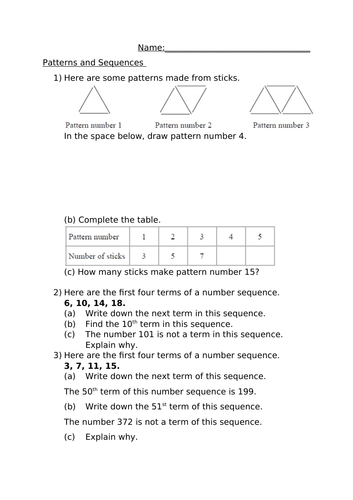 Free math worksheets patterns and sequences. Pattern Worksheets - Free Printables - Math Fun Worksheets PATTERN WORKSHEETS Learn to observe the pattern of colors, shapes, numbers, letters and objects in these pattern worksheets . Different themes are used and a lot of activities are included for practise . Follow the pattern to find the missing ones and complete them. Printable pattern charts are also free to download. Pattern - Charts Chart #1 Arithmetic Sequences Worksheets | Printable Free Online PDFs Arithmetic sequences worksheets help students build basic ideas on sequences and series in mathematics. Benefits of Arithmetic sequences Worksheets Sequences play an important role in our life. Practicing arithmetic sequences worksheets help us to predict and evaluate the outcome of a situation. Patterns and Sequence Worksheets - Math Worksheets Land Sudoku Math Patterns - The name of this puzzle game comes from the Japanese words for "single number". Once you get a hang of these, you will see how it is all about the sequence. Understanding Numeric Patterns - This is a basic introduction to the skills we will be learning in this topic. We show you how to make sense of these types of problems. Maths worksheet: Sequences from patterns | Teaching Resources Maths worksheet: Sequences from patterns. Subject: Mathematics. Age range: 14-16. Resource type: Worksheet/Activity. 4.6 44 reviews. Tristanjones. 4.461387434554979 8763 reviews. Last updated. ... Great worksheet thanks for sharing especially since its FREE! Empty reply does not make any sense for the end user. Submit reply Cancel. kooldude. a ...